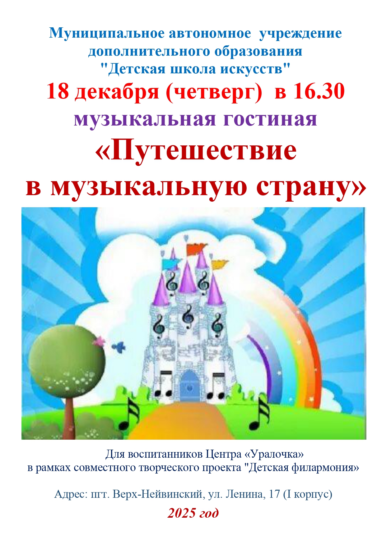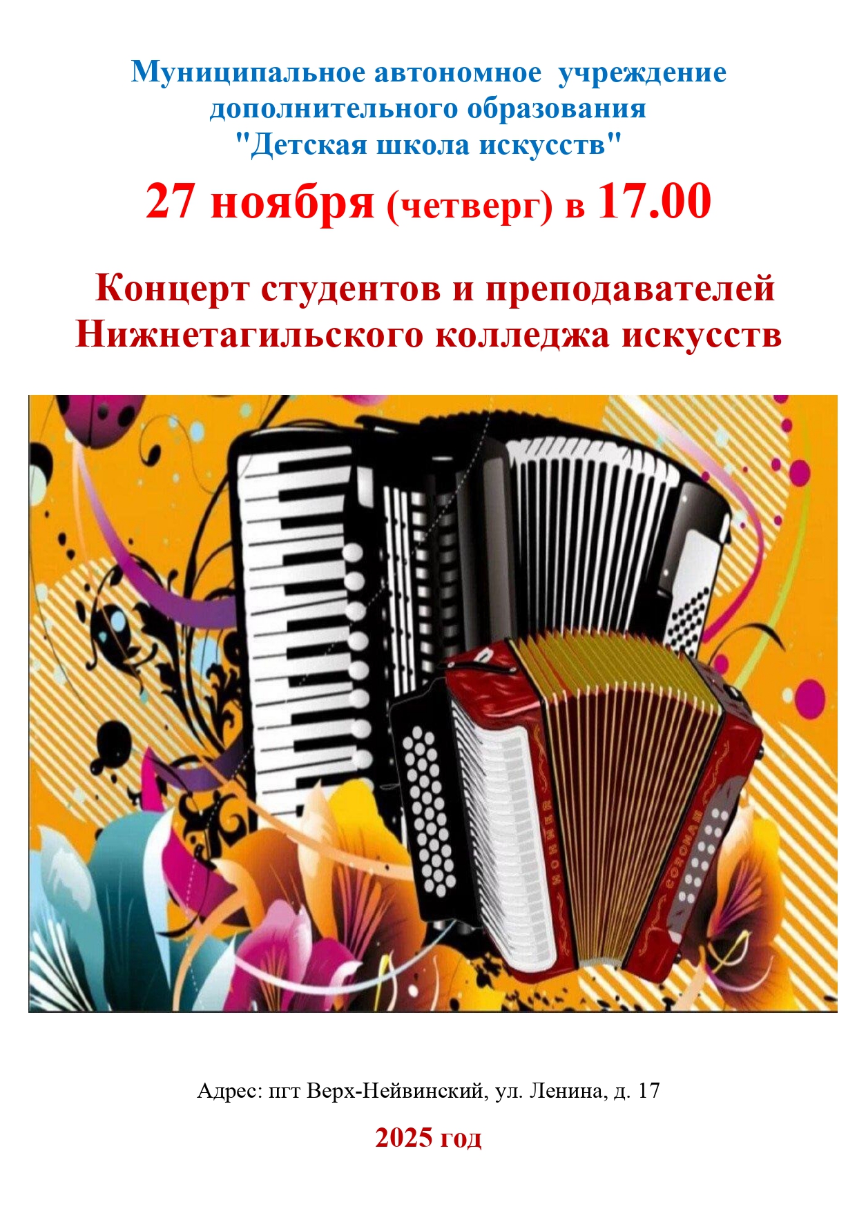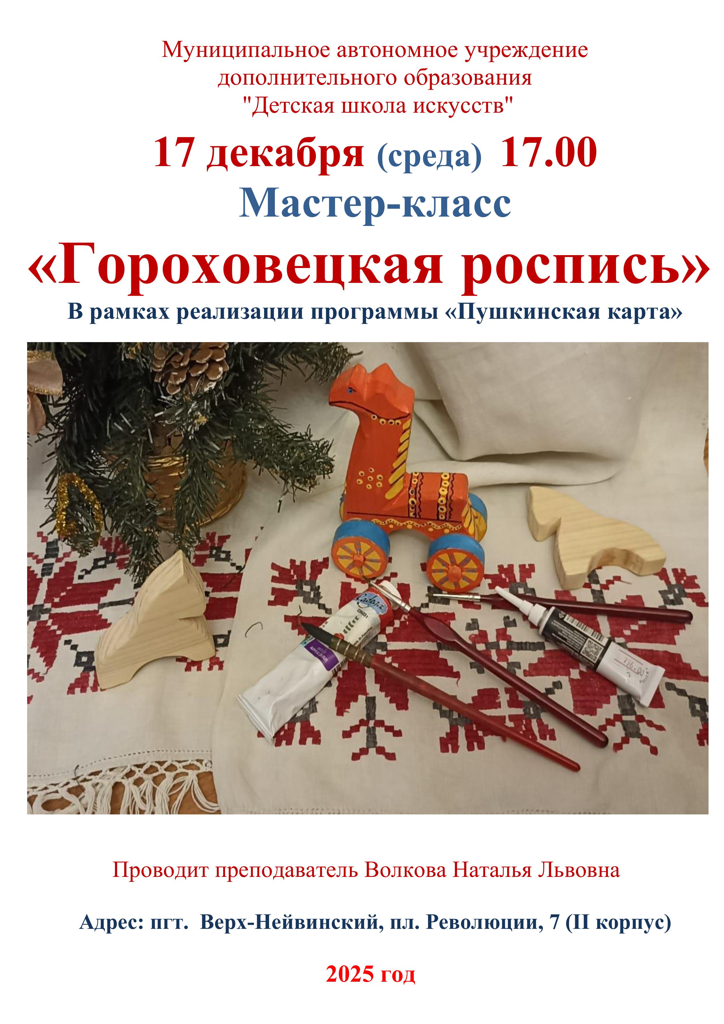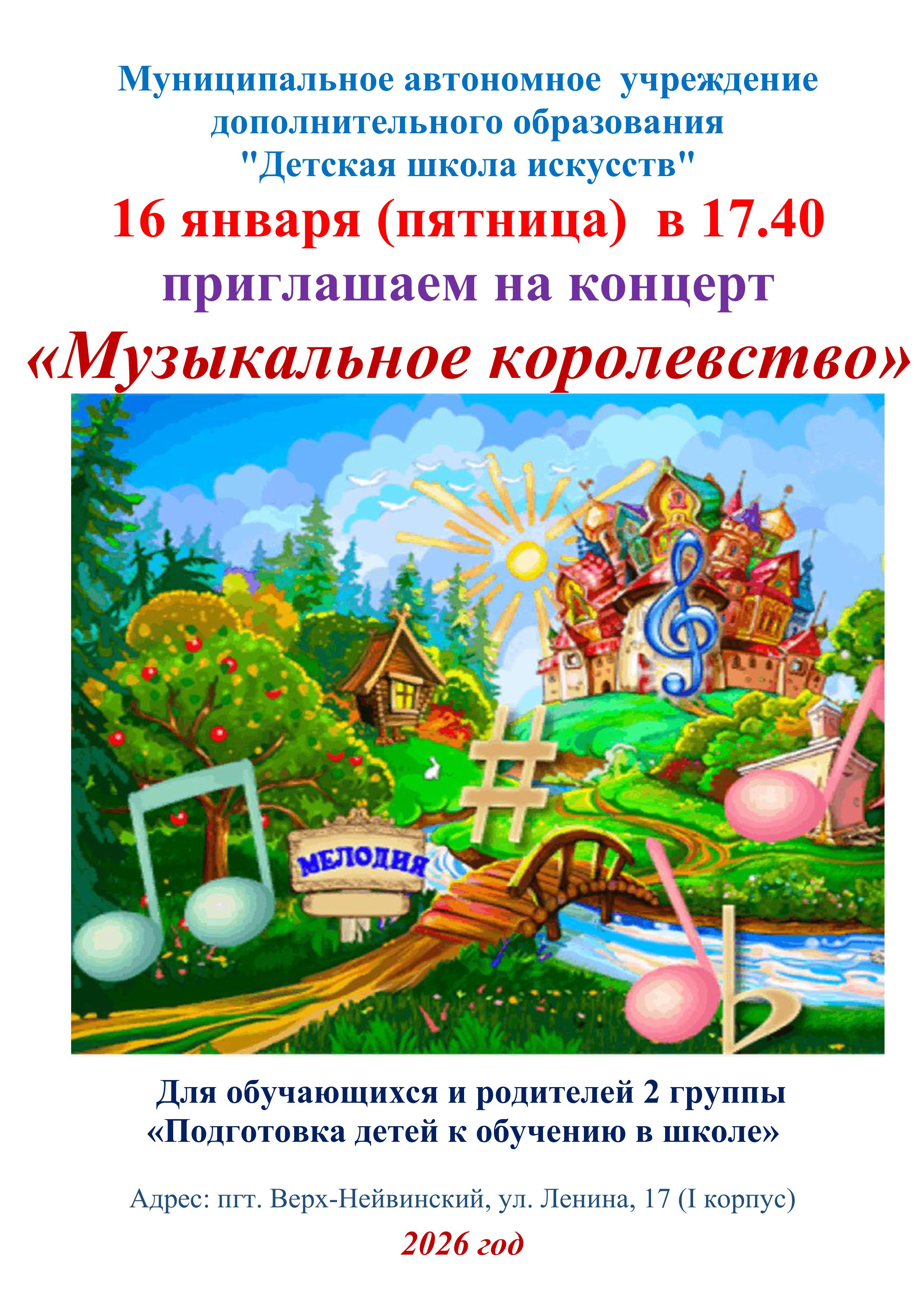 Афиша 16 января 2026 Концерт для воспитанников Центра "Уралочка" - "Музыкальный сундучок" 16 января 2026 Мастер-класс для пенсионеров и ветеранов г. о. Верх-Нейвинский в рамках социо-культурного проекта "Детская филармония" 16 января 2026 Мастер-класс для обучающихся МАОУ "СОШ им. А.Н.Арапова" - изготовление праздничной открытки "Символ года" 14 января 2026 XX Детский фестиваль искусств "Январские вечера" - "В гостях у Русалочки" 12 января 2026 Концерт для дошкольников группы подготовки к школе - "Музыкальное королевство" 15 декабря 2025 Новогодний праздник для учащихся ДШИ 11 декабря 2025 "Путешествие в музыкальную страну" - концерт для воспитанников Центра "Уралочка" 11 декабря 2025 Мастер-класс по изготовлению новогодней открытки 09 декабря 2025 Открытые занятия в группах раннего эстетического развития детей и в группах подготовки детей к обучению в школе 01 декабря 2025 Мастер-класс "Гороховецкая роспись" 28 ноября 2025 Музыкальная гостиная "О верю, верю: счастье есть!" 21 ноября 2025 Мастер-класс ко Дню матери для воспитанников детского сада "Солнышко" 20 ноября 2025 Концерт студентов и преподавателей Нижнетагильского колледжа искусств 20 ноября 2025 Спектакль "Скамейка" в Центре культурного досуга 21 ноября 2025 г. 17 ноября 2025 Посвящение в юные музыканты, художники и театралы - 2025 13 ноября 2025 "Её величество Музыка" - музыкальная гостиная для воспитанников Центра "Уралочка" В начало Назад 1 2 3 4 5 6 7 8 9 10 Вперед В конец