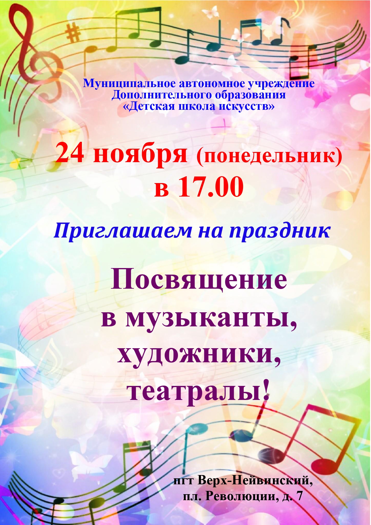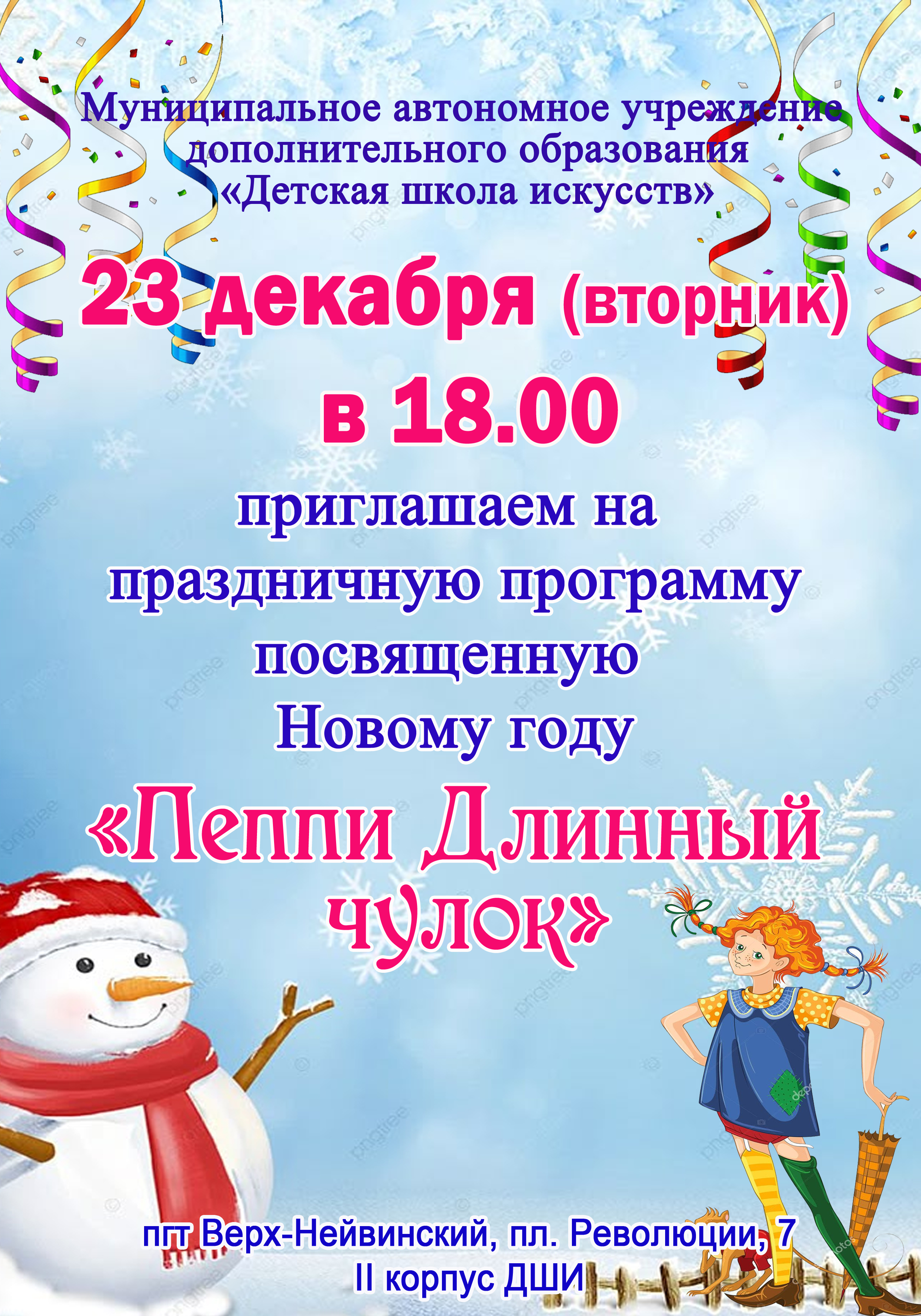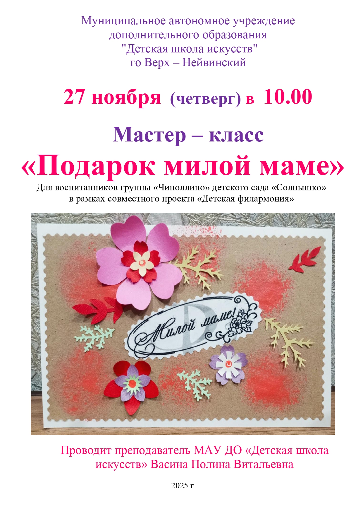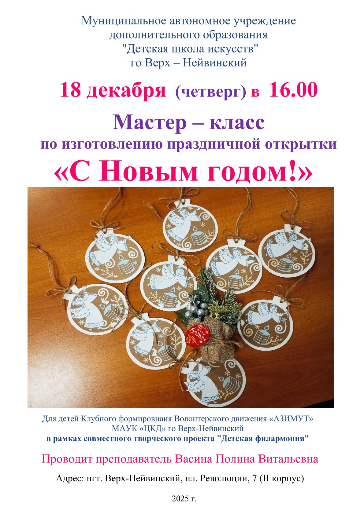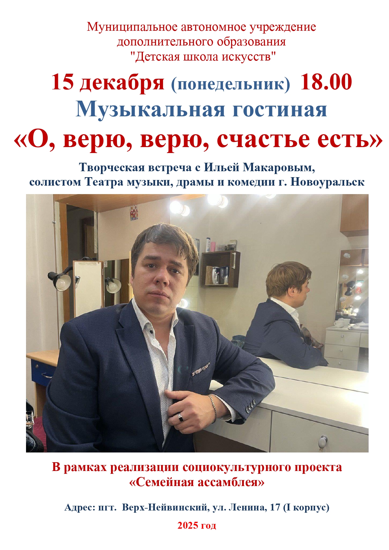 Афиша 16 января 2026 Концерт для воспитанников Центра "Уралочка" - "Музыкальный сундучок" 16 января 2026 Мастер-класс для пенсионеров и ветеранов г. о. Верх-Нейвинский в рамках социо-культурного проекта "Детская филармония" 16 января 2026 Мастер-класс для обучающихся МАОУ "СОШ им. А.Н.Арапова" - изготовление праздничной открытки "Символ года" 14 января 2026 XX Детский фестиваль искусств "Январские вечера" - "В гостях у Русалочки" 12 января 2026 Концерт для дошкольников группы подготовки к школе - "Музыкальное королевство" 15 декабря 2025 Новогодний праздник для учащихся ДШИ 11 декабря 2025 "Путешествие в музыкальную страну" - концерт для воспитанников Центра "Уралочка" 11 декабря 2025 Мастер-класс по изготовлению новогодней открытки 09 декабря 2025 Открытые занятия в группах раннего эстетического развития детей и в группах подготовки детей к обучению в школе 01 декабря 2025 Мастер-класс "Гороховецкая роспись" 28 ноября 2025 Музыкальная гостиная "О верю, верю: счастье есть!" 21 ноября 2025 Мастер-класс ко Дню матери для воспитанников детского сада "Солнышко" 20 ноября 2025 Концерт студентов и преподавателей Нижнетагильского колледжа искусств 20 ноября 2025 Спектакль "Скамейка" в Центре культурного досуга 21 ноября 2025 г. 17 ноября 2025 Посвящение в юные музыканты, художники и театралы - 2025 13 ноября 2025 "Её величество Музыка" - музыкальная гостиная для воспитанников Центра "Уралочка" В начало Назад 1 2 3 4 5 6 7 8 9 10 Вперед В конец