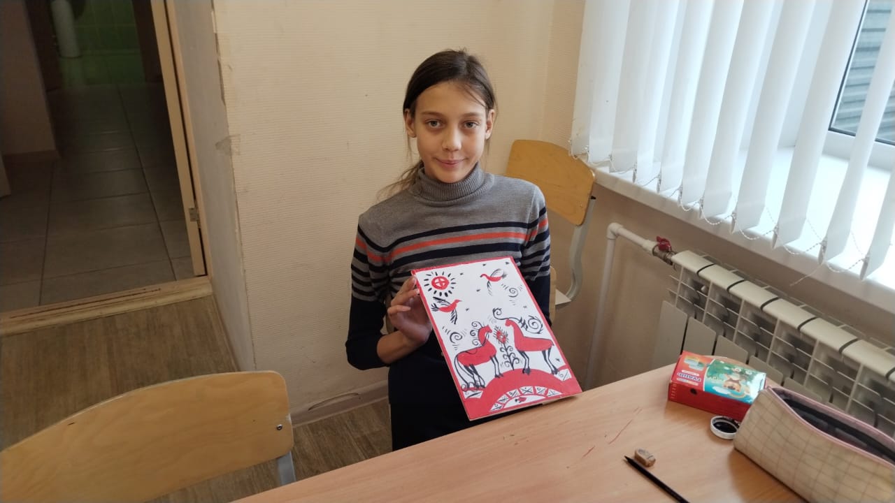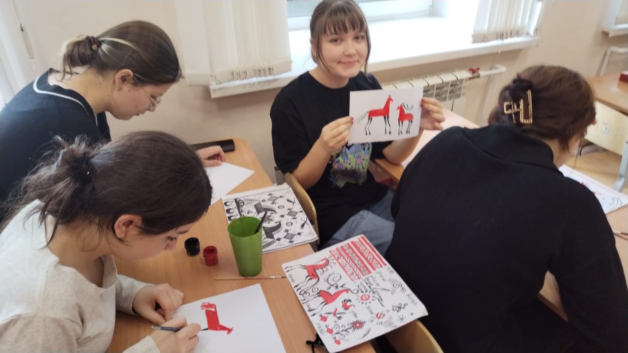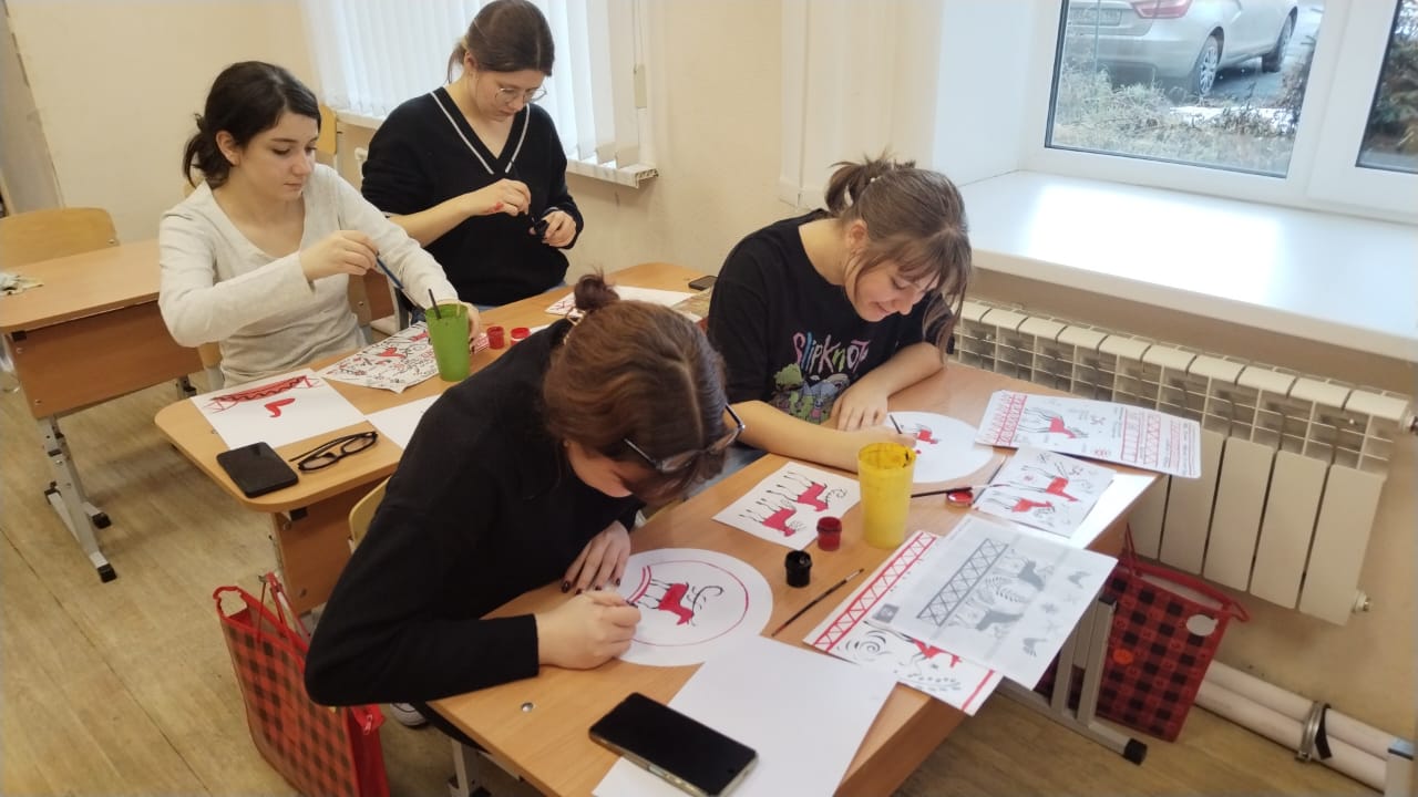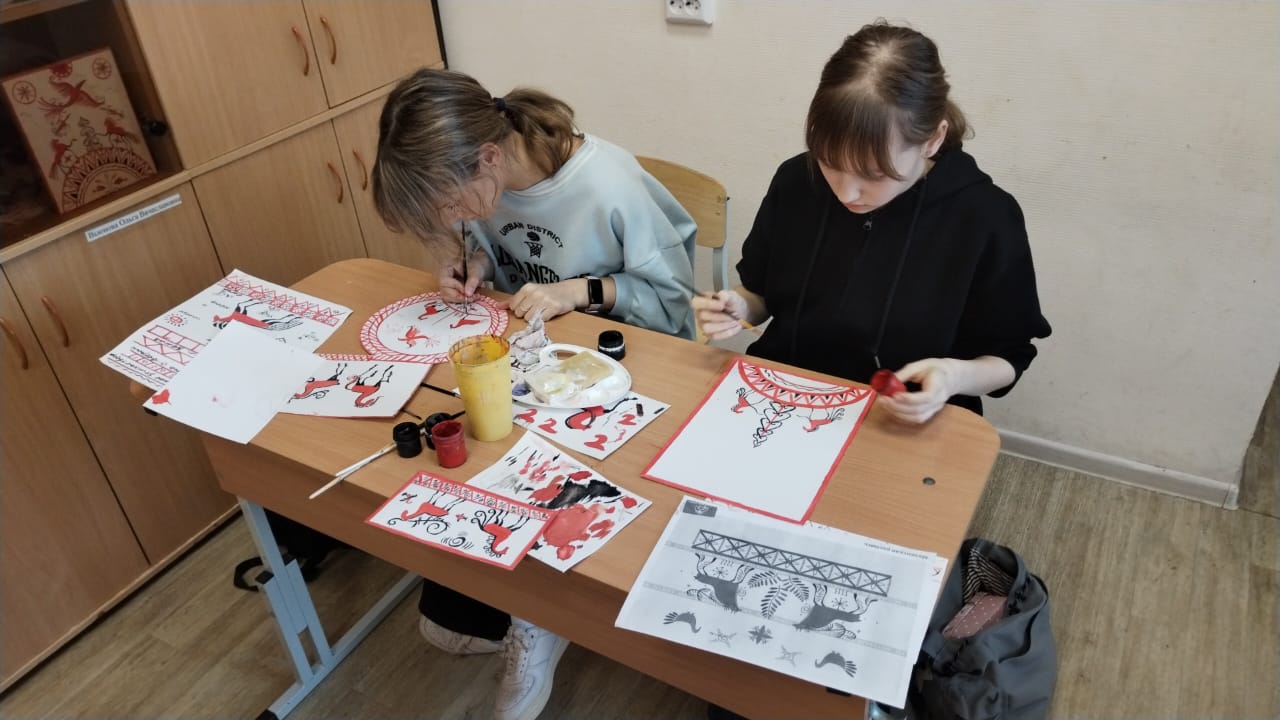 Учащиеся познакомились с историей происхождения, промысла XIX века в селе Палащелье на реке Мезень. После знакомства с символикой и семантикой промысла учащиеся выполнили упражнения, а после расписали Мезенской росписью панно, которым дети украсят свой дом.
