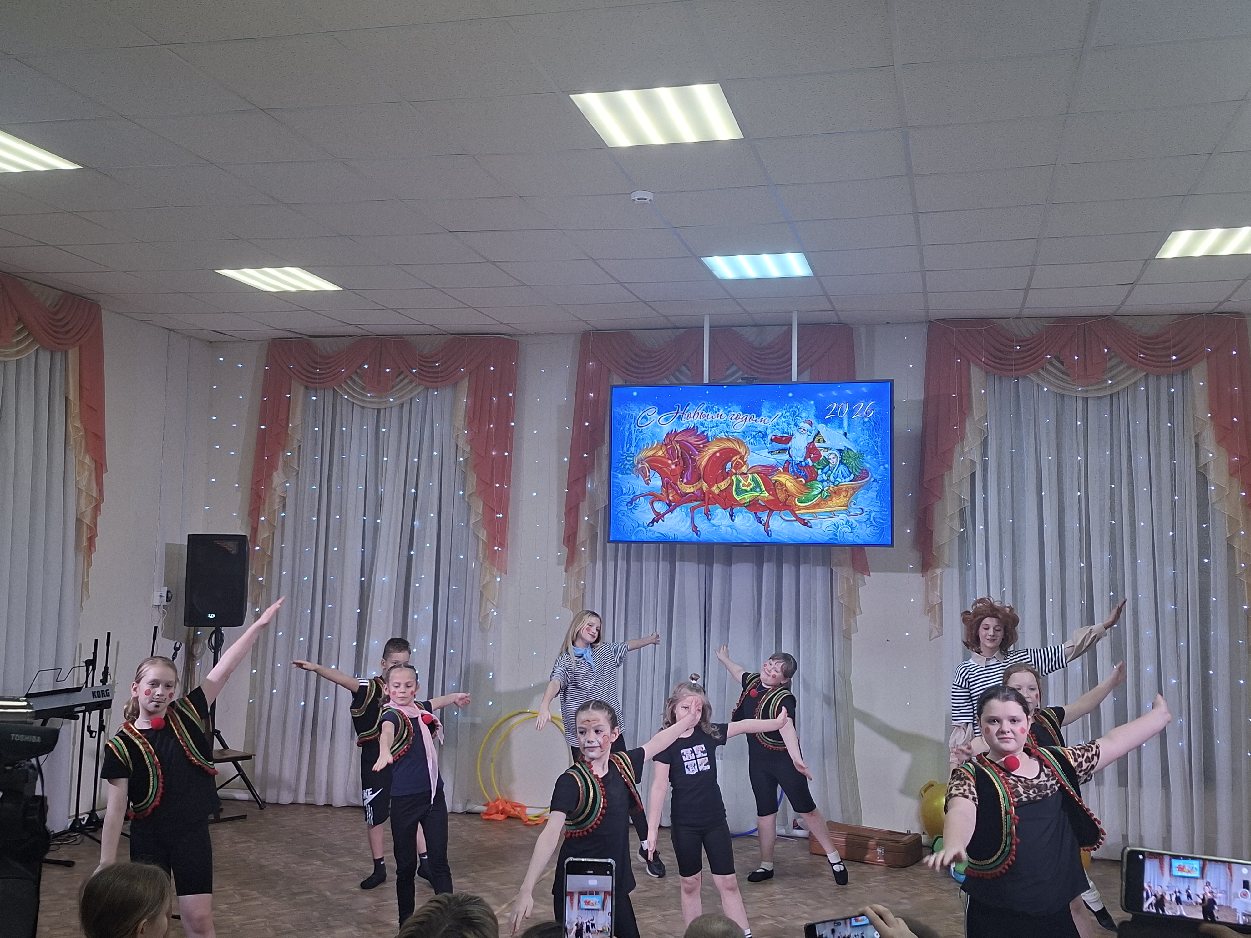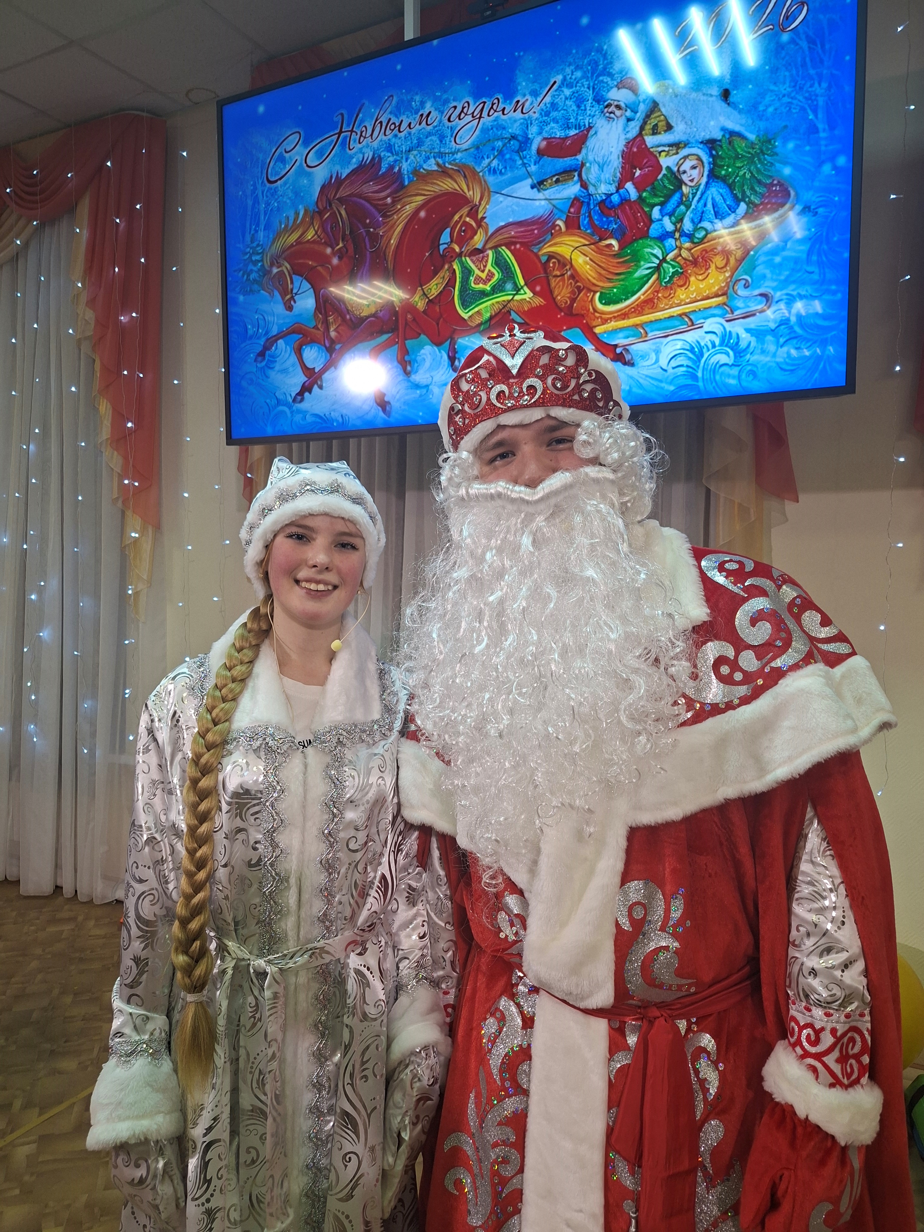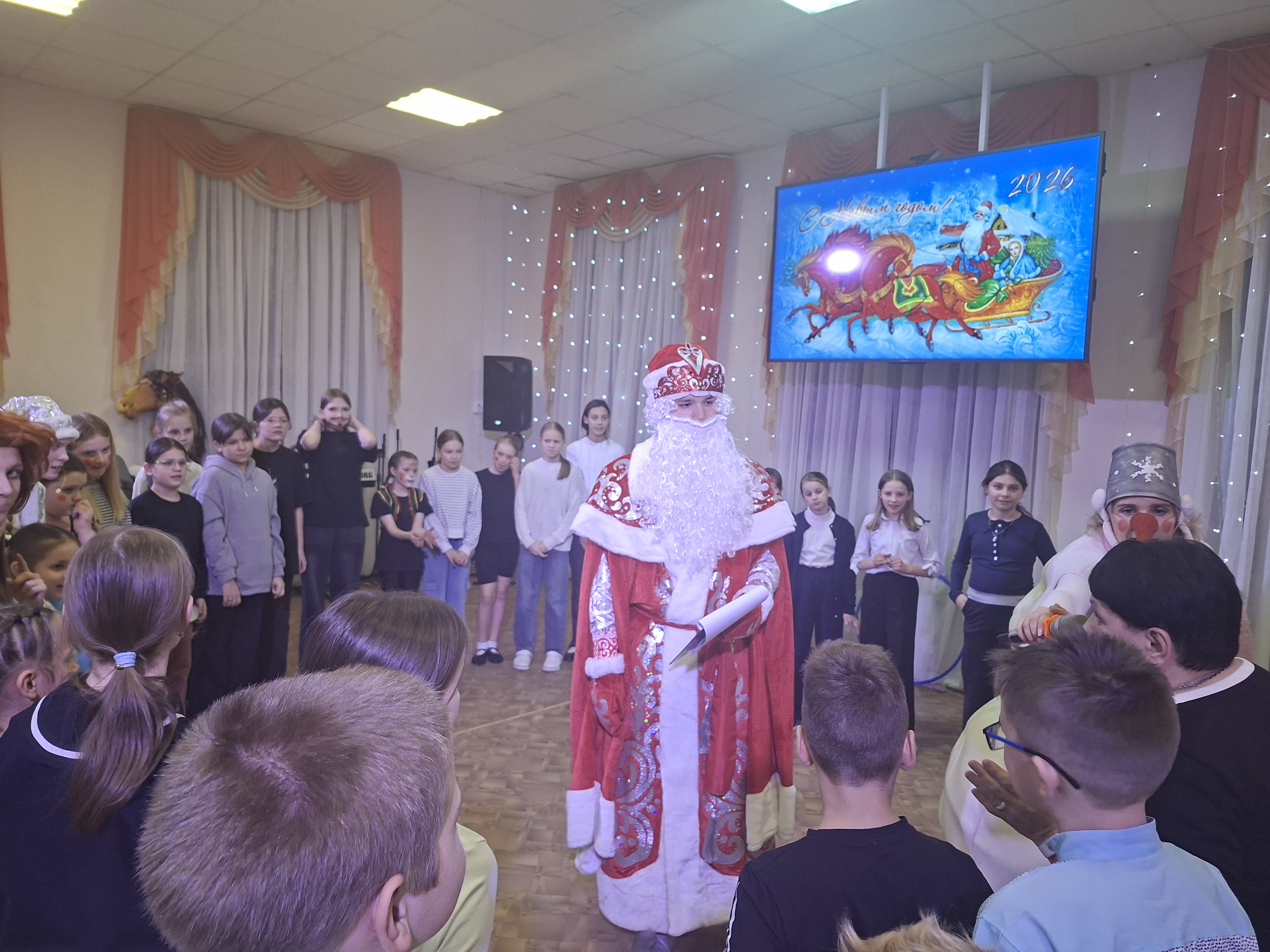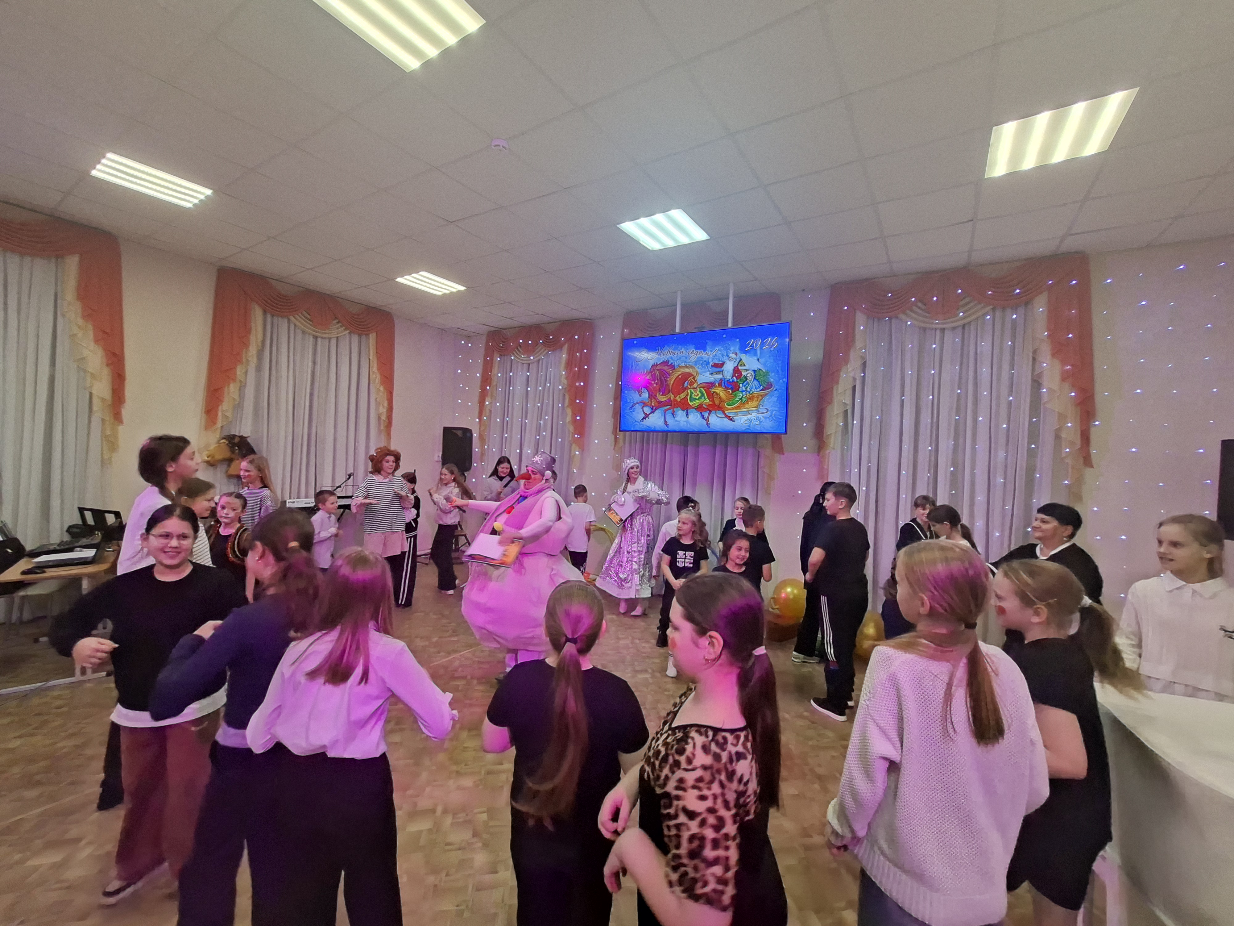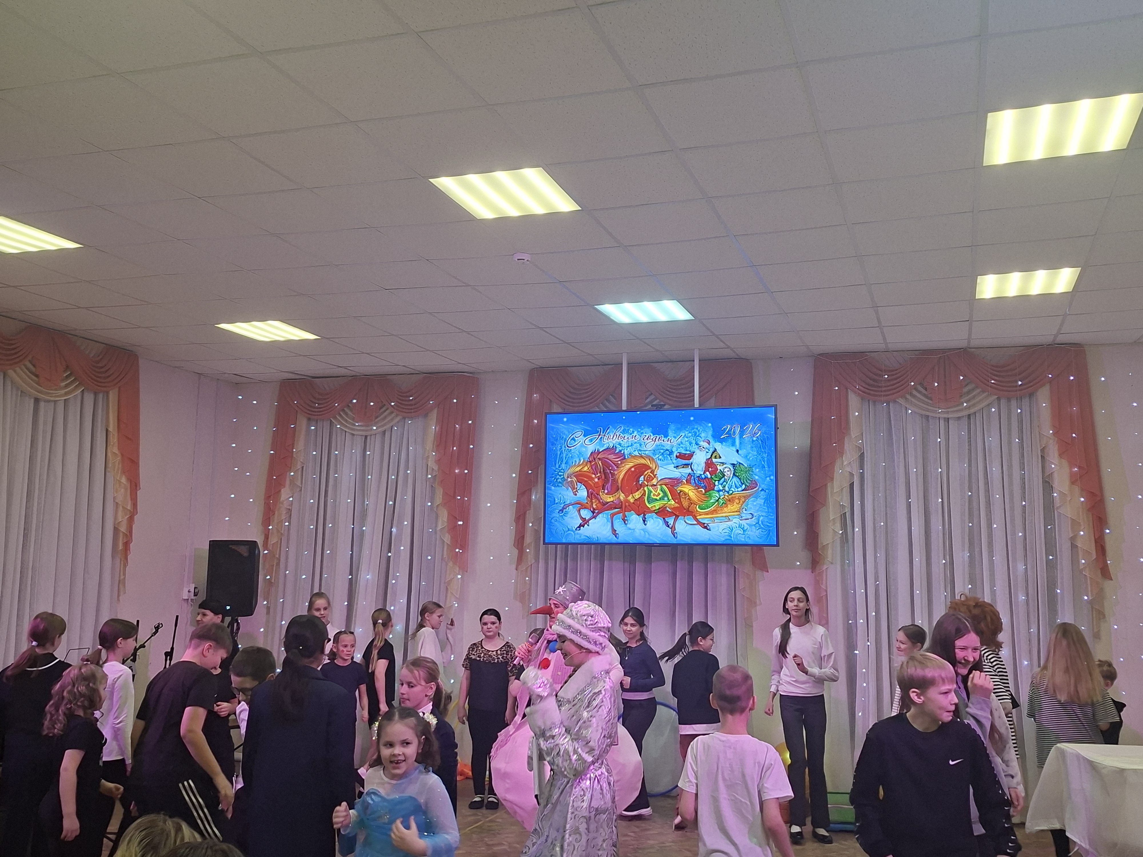 После представления началась самая настоящая феерия с героями новогодних праздников – зимняя история с участием Деда Мороза (Максим Епифанов), Снегурочки (Ирина Корюкова) и весёлого Снеговика (Мария Владимировна Салмина). Эти три известных всем персонажа провели с ребятами и взрослыми увлекательные конкурсы, весёлые игры и танцевальные номера. Учащиеся отделения «Искусство театра» представили динамичный танец «Вертолёт» (преподаватель Светлана Леонидовна Янченкова). Атмосферу торжества дополнили яркие костюмы героев, красочное украшение зала и специально подготовленные для участников сюрпризы. Сценарий новогоднего праздника для всех учащихся и их родителей подготовила Светлана Ивановна Казакова.