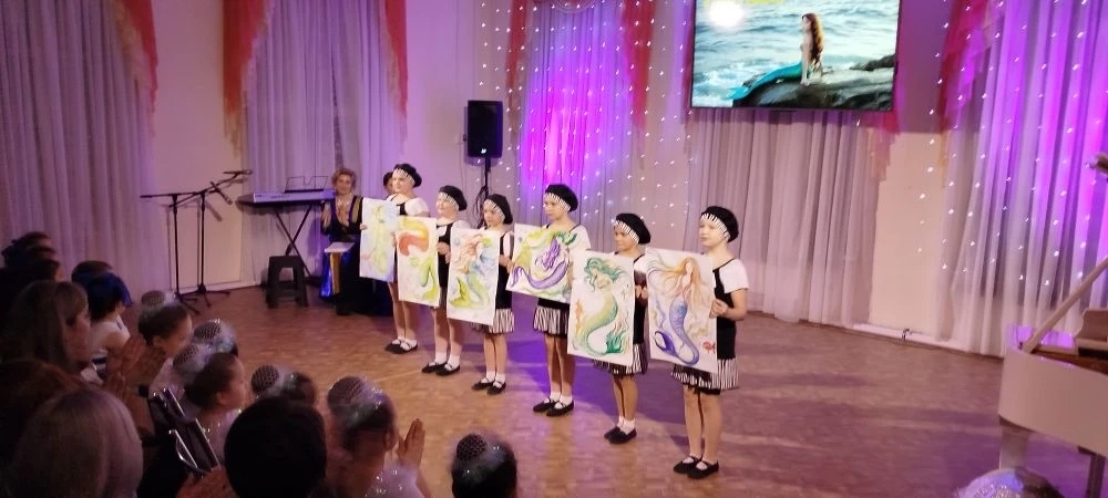С первых минут представления зрителей очаровала атмосфера волшебства. Красочные костюмы, сказочное освещение (мастер по свету Александра Серебрянникова), яркие слайды, и завораживающие видеопроекции на экране (преподаватель ДШИ Инна Николаевна Федулова) погружали в подводный мир Русалочки. Музыкальное сопровождение концерта поражало разнообразием: нежные звуки блокфлейты в руках Мавзуны Абдуллои (преподаватель Владимир Викторович Попов, концертмейстер Светлана Ивановна Казакова) сменялись энергичными ритмами саксофона в исполнении Егора Полякова (преподаватель Владимир Викторович Попов, концертмейстер Светлана Ивановна Казакова), виртуозные пассажи скрипки (Эльвира Садрисламовна Сагирова и ансамбль скрипачей «Скерцо», концертмейстер Ирина Юрьевна Филякина) – зажигательными ритмами «Летки-енки» в исполнении фортепианного дуэта Ульяна Щукина – Ольга Викторовна Малова, всех покорил «Русский танец» из балета «Лебединое озеро» П.И.Чайковского в исполнении Эльвиры Садрисламовны Сагировой (скрипка), Анастасии Гайдуновой (флейта) и концертмейстера Светланы Ивановны Казаковой. Выступление ансамбля мальчиков ДШИ (руководитель Анатолий Фёдорович Чуркин, концертмейстер – Светлана Ивановна Казакова) с песней «Мы – моряки!» было бодрым, ярким и оптимистичным. Ансамбль ударных инструментов (руководитель Кристина Максимовна Рябова, концертмейстер Инна Николаевна Федулова) добавили волшебного колорита, создавая неповторимую звуковую картину в Танце Феи Драже из балета П.И. Чайковского «Щелкунчик». Учащиеся отделения «Искусство театра» элегантно дефилировали с портретами Русалочки, выполненными преподавателем Ольгой Владимировной Мягковой. Запомнились великолепные танцевальные номера: юные танцоры из детского сада «Солнышко» грациозно изображали «Жемчужины» (руководитель Марина Сергеевна Лисина) и «Подводный мир Русалочки» (руководитель Галина Михайловна Максимова), а участники Студии современного танца «Провинция» (Центр культурного досуга, руководитель Варвара Владимировна Крючкова) представили современную хореографию в композиции «Под шелест страниц». Учащаяся Средней общеобразовательной школы им. А.Н.Арапова и ДШИ Элина Никифорова проникновенно и поэтично прочитала стихотворение В.В.Маяковского «Послушайте!» (руководители – учитель МАОУ «СОШ им. А.Н.Арапова» Ирина Сергеевна Клешнева и преподаватель МАУ ДО «ДШИ» Мария Владимировна Салмина).