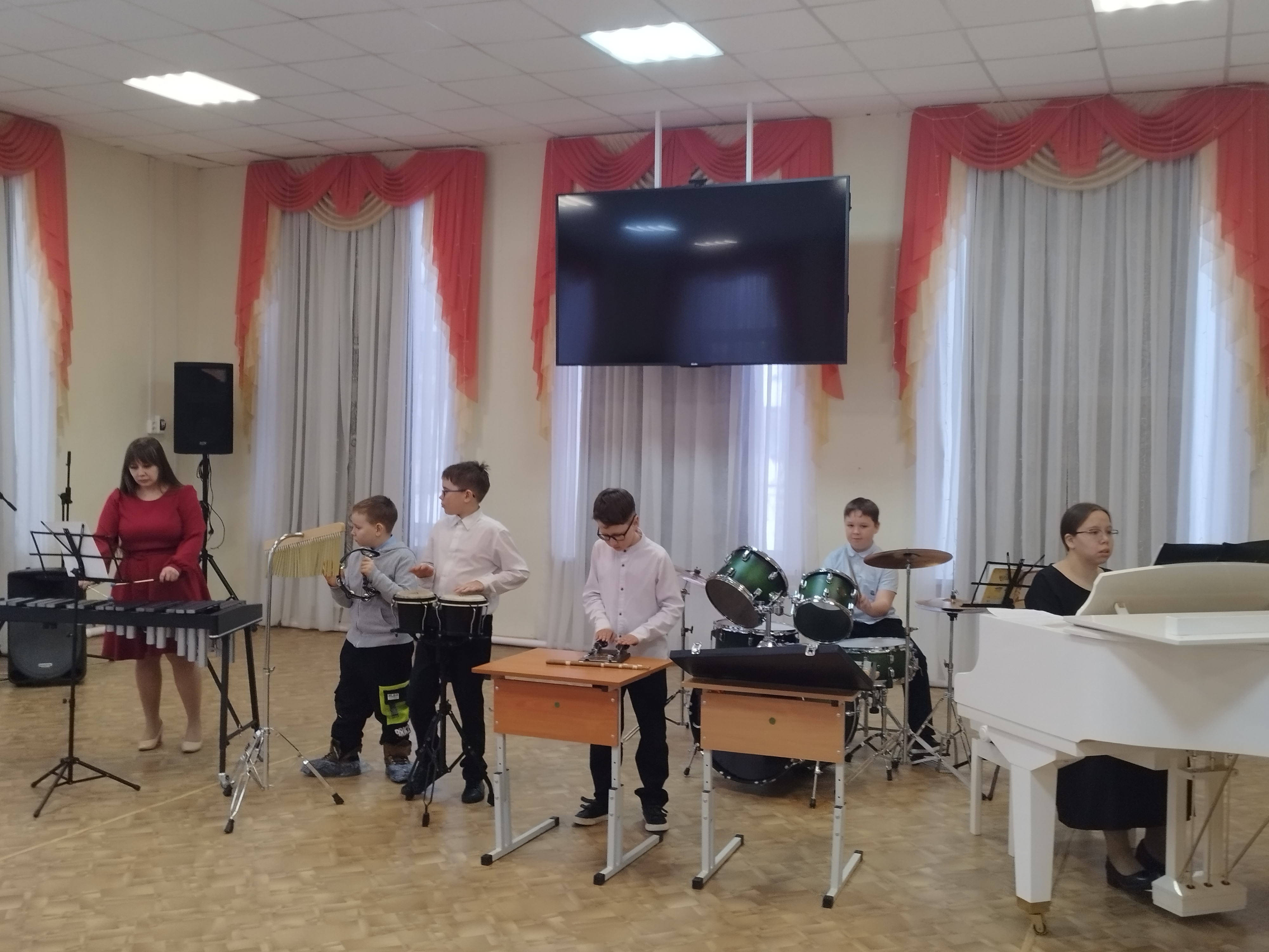 - «Начальные навыки игры на ударных инструментах» с учащимися по классу ударных инструментов, преподаватель Кристина Максимовна Рябова, концертмейстер Инна Николаевна Федулова. В ходе урока учащиеся продемонстрировали свои навыки, исполнив произведения из текущего репертуара. Юные музыканты показали, как они справляются с различными видами технических сложностей при игре на ударных инструментах: ксилофоне, глоккеншпиле, малом барабане, ударной установке, - стараясь передать характер и настроение каждого музыкального номера. Особую ценность урок имел для родителей юных музыкантов. Присутствующие смогли не только услышать выступление своих детей, но и понять специфику домашних занятий. Преподаватель акцентировала внимание на том, какие аспекты исполнения требуют особого контроля при самостоятельной работе, чтобы достичь стабильных и качественных результатов.