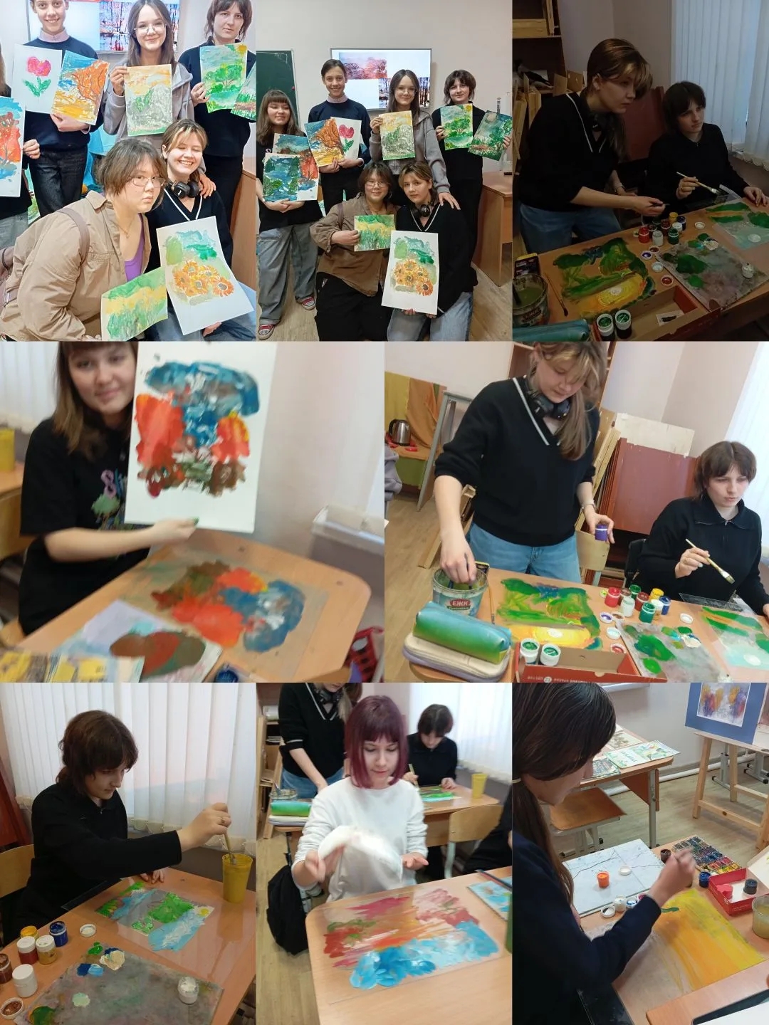 - «Пейзаж в технике монотипия» - провела преподаватель Наталья Сергеевна Таланкина. Учащиеся создавали пейзаж при помощи стекла. Гуашевыми красками легко передавали мягкие переходы неба, земли, отражение воды, которые сложно повторить кистью. Пейзажи получились очень живописные, глубокие и фактурные.